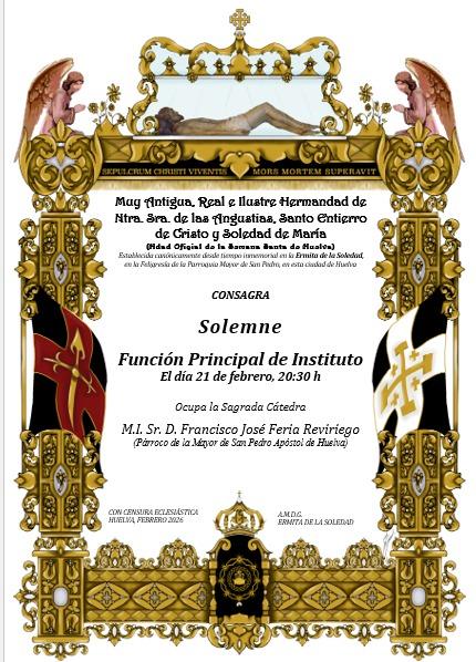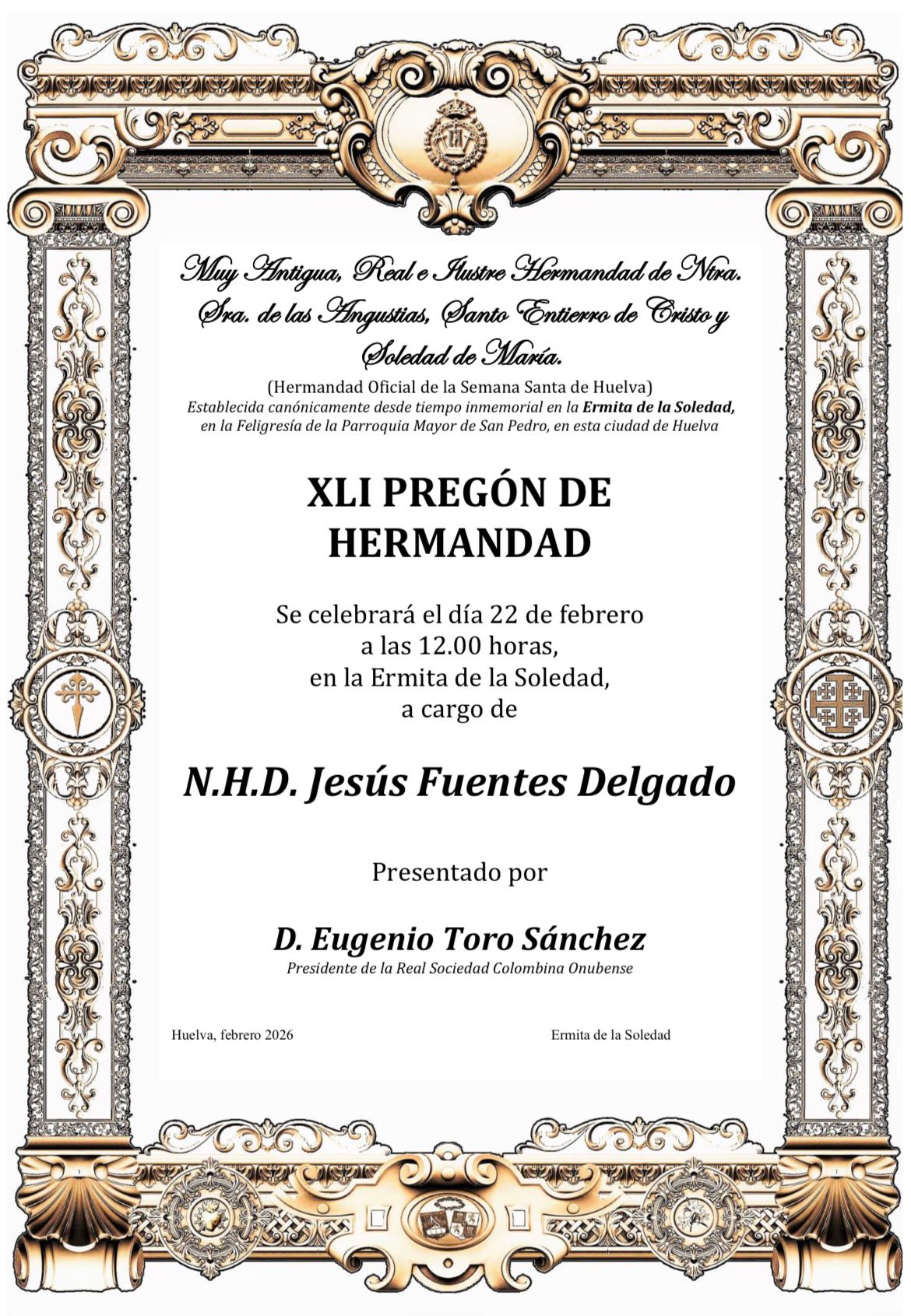 El sábado 21 a las 20:30 horas, Solemne Función Principal de Instituto, donde los hermanos haremos protestación de fe.Como colofón a la semana, el domingo 22 a las 12:00 horas, XLI Pregón de Hermandad, a cargo de N.H.D. Jesús Fuentes Delgado, y presentado por Eugenio Toro Sánchez.