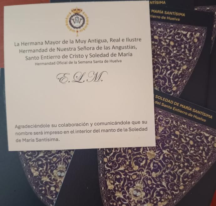 Para ello arrancamos esta campaña de captación de colaboraciones denominada "llévame bajo tu manto", confiando que la Huelva cofrade, amante de sus tradiciones y su historia, de un paso al frente y respalde esta ilusionante iniciativa. La cuestación de donativos en general para esta causa está abierta a todas las capacidades, quedando reflejado en el forro del manto todas las personas y entidades colaboradoras, de la siguiente manera: